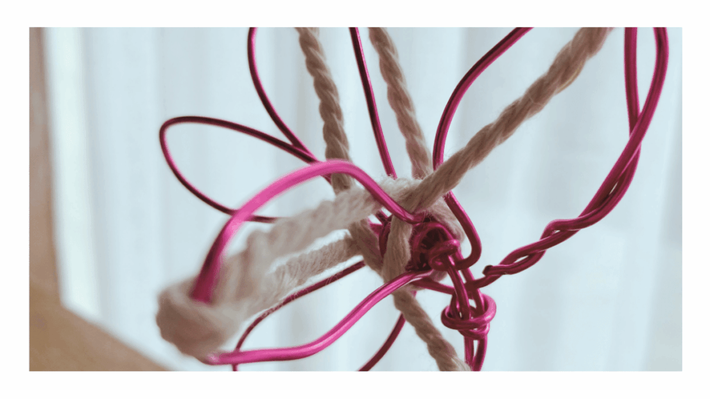 Dobrze, gdy na tym etapie uczestnik ma pewną swobodę wyboru materiałów. Jeśli korzystamy na przykład ze sznurków czy drutu, warto przygotować kilka ich rodzajów — różniących się kolorem, grubością, fakturą czy stopniem sztywności. Taki wybór sam w sobie może być elementem procesu twórczego. Oczywiście można zaproponować pracę z jednego rodzaju materiału, jednak możliwość wyboru bywa istotna, ponieważ pozwala uczestnikowi szukać takiej formy wyrazu, która jest mu w danym momencie bliższa.